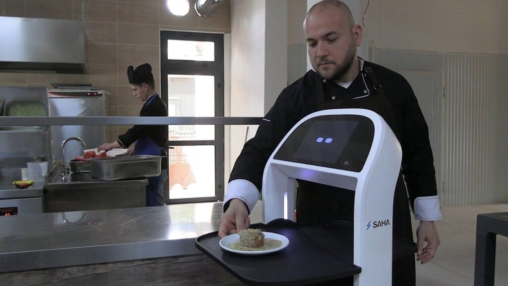 Taşkın, Meriç Sosyal Tesisleri’nde başlatılan dijital dönüşüm çalışmaları kapsamında yapay zeka destekli otonom servis, hizmet ve teslimat robotunun kullanılmaya başlandığını